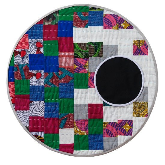 Weaving threads of African American experiences with broader ideas of identity, and collective history, my work investigates the fragile interconnectivity among all living things. Fragmented, constructed, and reassembled, I shed light on the multifaceted and complex parallels between the creative process and the nature of personal identity. My paintings feature abstracted, geometric shapes that imply movement – colourful forms expand and collapse freely among glittery backgrounds with hints of landscape and structural objects such as rooftops, windows and doors. While the textiles draw on the domestic and artistic traditions of quilt-making, they are pieced together, combining culturally diverse fabrics. While my work pays homage to the past through the use of repurposed fabrics and historical iconography, its bright atheistic imagery is informed by the future. The art reminds us of the importance of renewal and rebuilding, not only through the artistic process, but also through the possibility of transformative change. – ADIA MILLETT