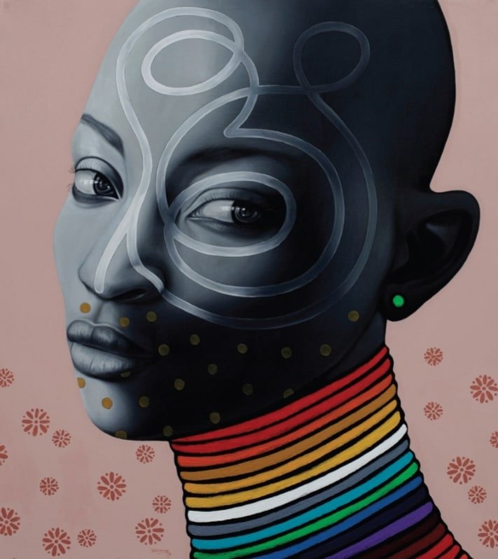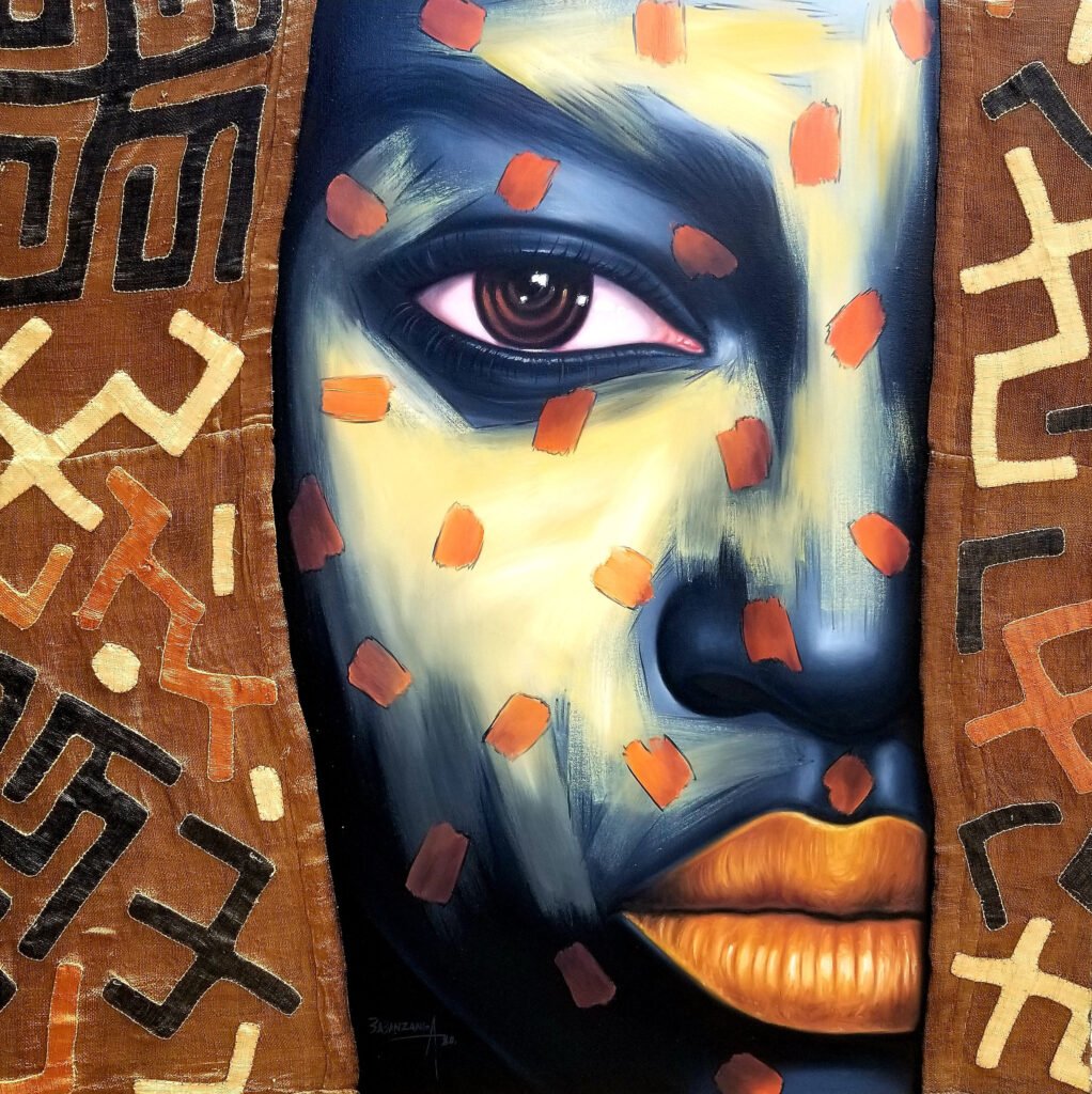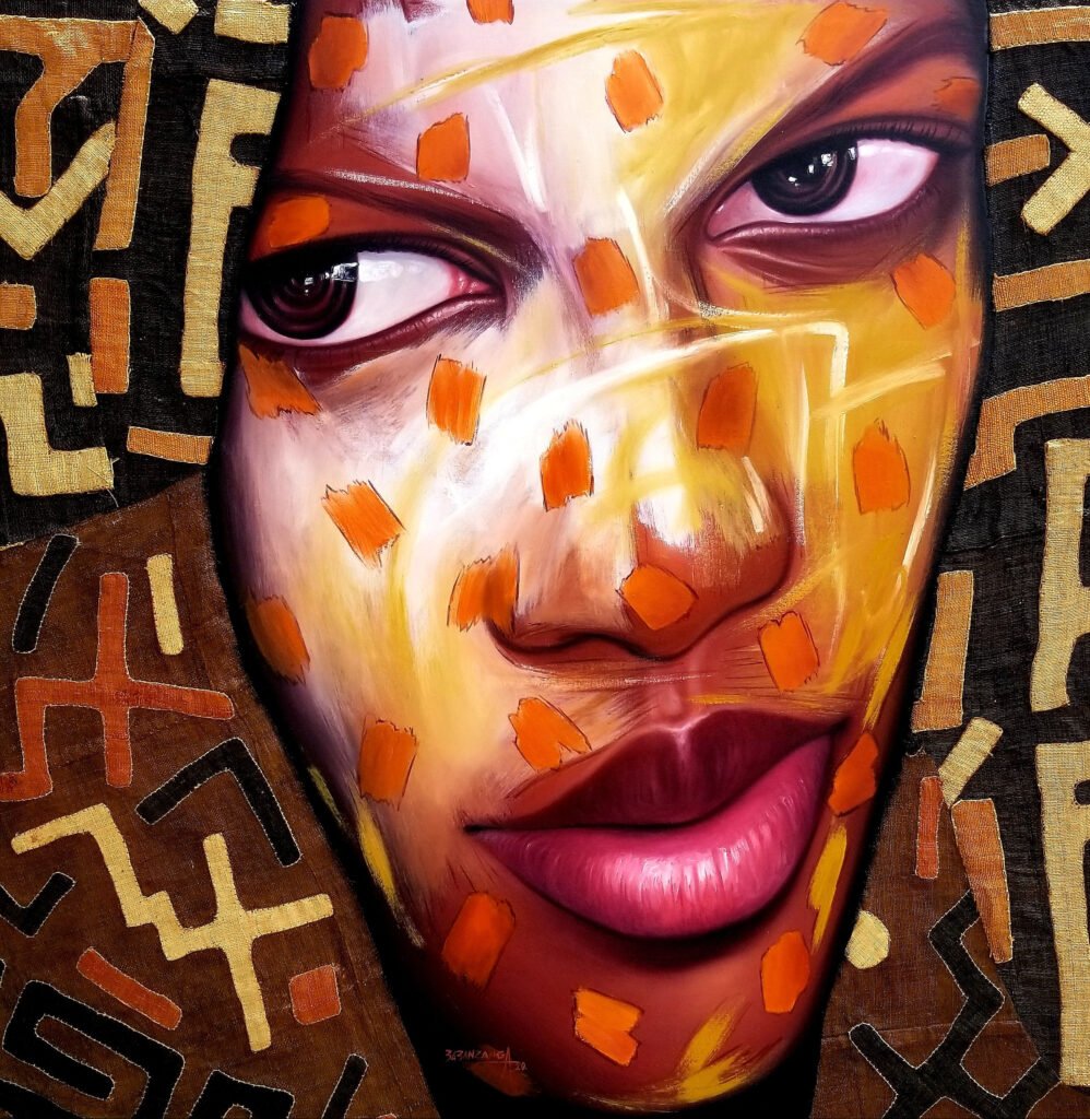 The colours and patterns appearing in Babanzanga’s art pay tribute to the visual heritage of the Kongo, Luba, Pende and Kuba tribes from Congo, as well as the Maasai people of Kenya and Tanzania. From these ancestral references, he draws new patterns that the viewers are free to interpret in their own way, especially through his reinterpretation of facial scarification, a traditional symbol of tribal affiliation across several ethnicities on the continent. His focus on the face derives from the existential notion that sees the face and the gaze as windows to the individual’s inner beauty. It is again beauty that he seeks when using essentially children and young girl’s faces, in his eyes symbols of love and rebirth.