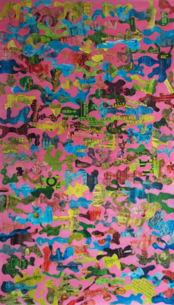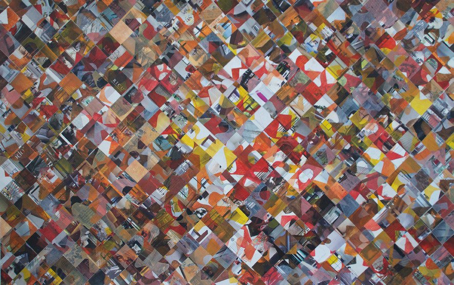 The image that was once a bold headline, new banner, or the newest eye catching product now struggles to be seen; muted, it now plays a secondary role to layers of paint and other mediums. The resulting serendipitous visual construction is an unsystematic reconfiguration and re-purposing to discuss culture, heritage and the symbolism of color.