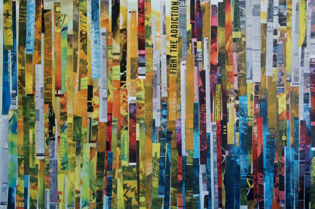 The publications are a natural fit for Gardner, as they offer random vibrant color pallets, much like that of a typical Caribbean environment, and a great mixture of text and professionally photographed images. However the colors are universal and allow a conceptual approach to finding the common ground among all cultures. The artist combines these media depictions and information with natural paper and synthetic materials to aid in his message. By deconstructing the images into strips, or bits of torn paper, and assigning new overlays of unifying colors to the materials, Gardner erodes the original content at various levels often reducing them to shades with traces of random colors. He also incorporates urban western grit, geometric African lines, contemporary images, and borrowed African and indigenous weaving techniques to create unified montage of textures.