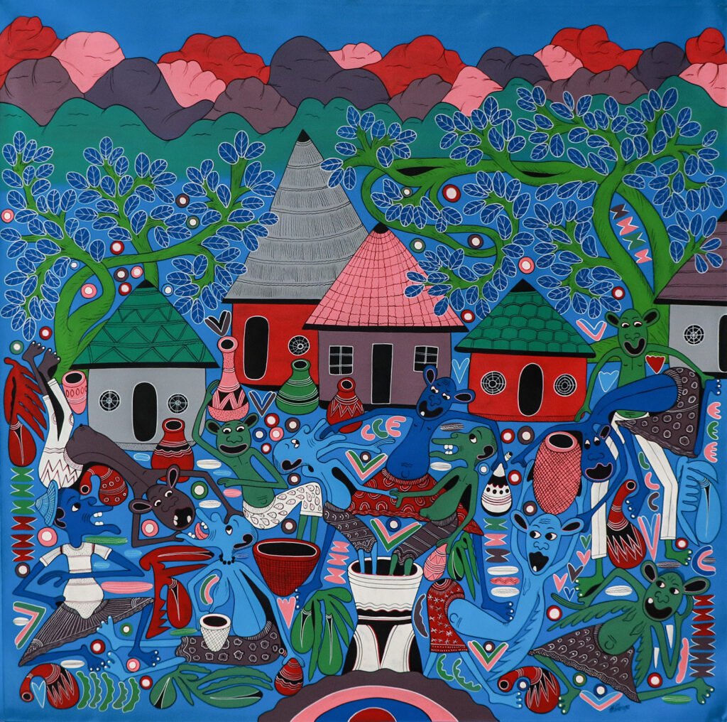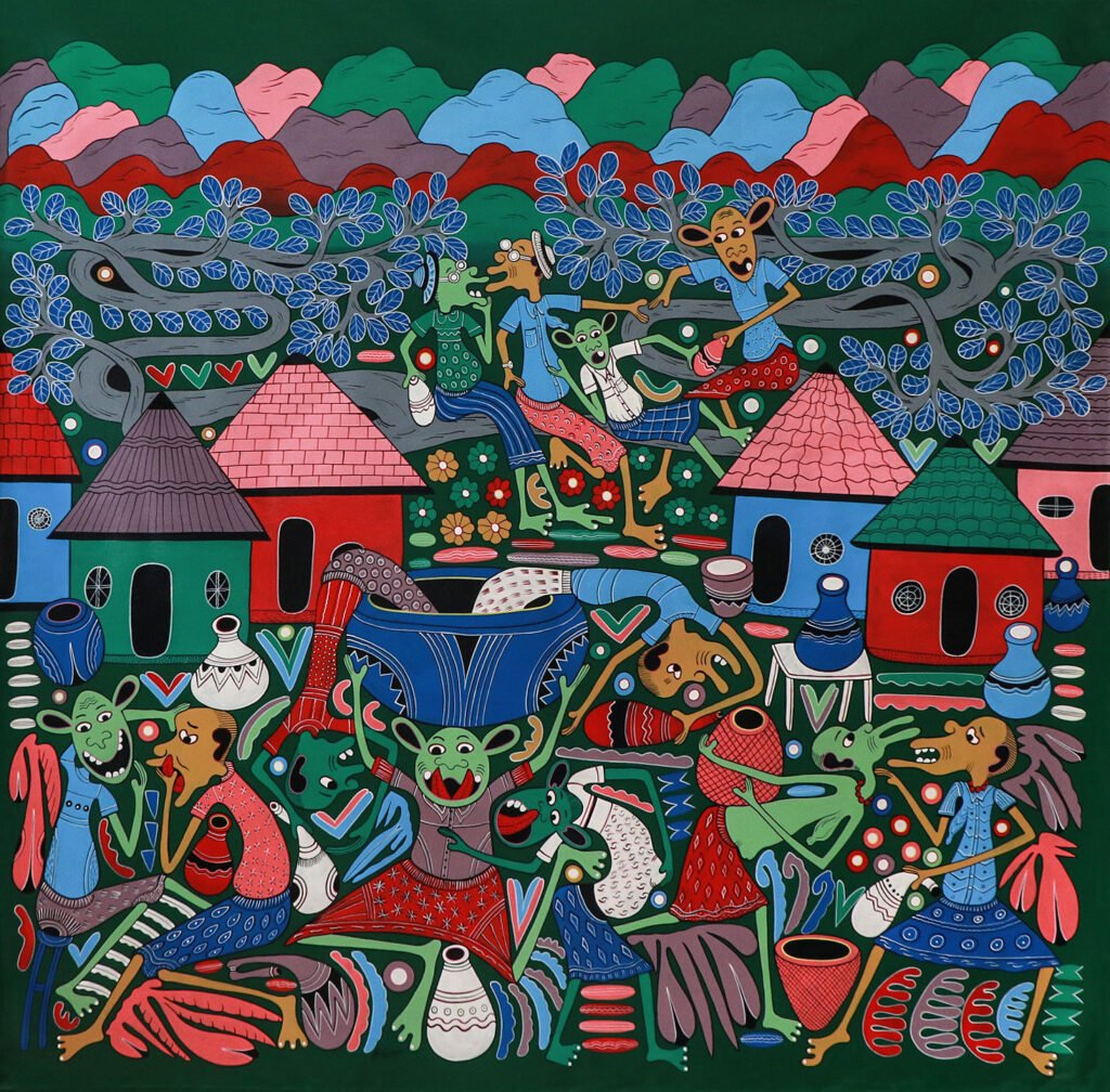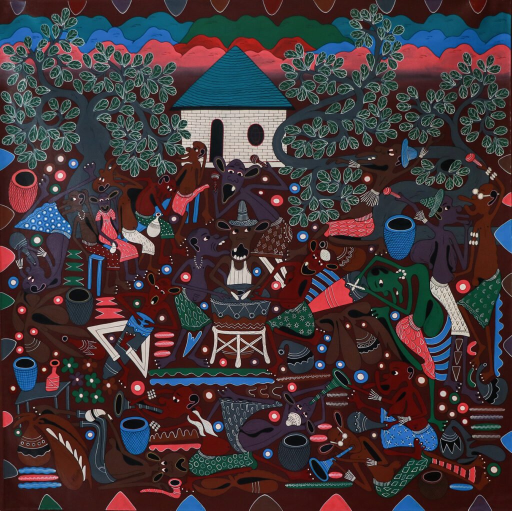Hendrick has also created tales to the paintings, and he wrote a story book. He found inspiration in the old Lilanga sketch book and to every sketch he added a story. That book he sold to George Lilanga who has then sold it further to a collector. He is one of few artists in Tanzania who has mastered this technique.