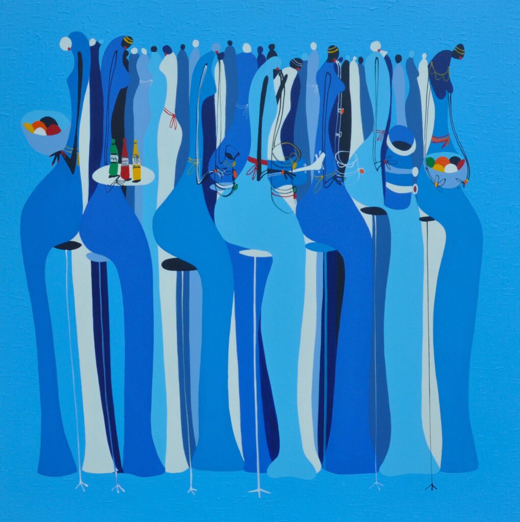 In his paintings, Agorsor uses pulsating colors that become an interpretation of the essence of lived experiences of Africans and the world at large. His subject matter borders on the generic but rendered often in a buoyant, semi-abstract and witty manner. His canvases may be sparsely populated; often with a solitary figure in a sensuous pose, two lovers enjoying the presence of each other or they may be very populated, inhabited by crowds of market women or glitterati at events. Some of the canvases may be encumbered with splashes, drips and flows of paint that intertwine to become forests or mazes of enchantment. His sculptures are an embodiment of spontaneous orderliness. He is an instrumentalist, composer, song writer and founder of Afro World Band Agorsor. Recently he has been spending a lot of time in the recording studio.