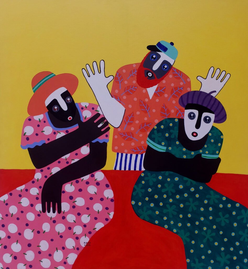 Attracted by Free Figuration and Naive Art, his works are the antipodes of public expectations through his half-child, half-adult characters with turned heads. It is a way for him to escape from life while making fun of his experience. “I would rather die of laughter than of boredom” is the quote that inspires his artistic approach. He represents linear human figures filled with color, alone and or in groups with turned faces, illustrating by this position the avoidance of the other’s gaze.