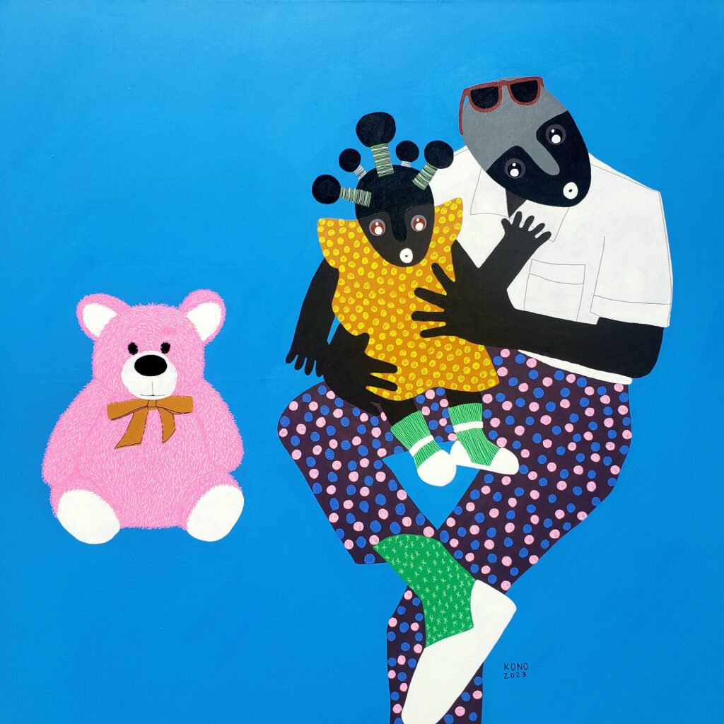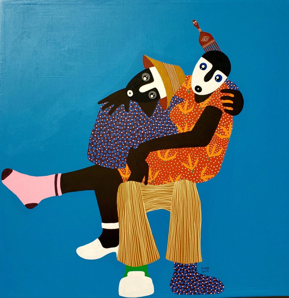 Kono represents the dreams of young children and adults through the human silhouette that he nicknamed ”Ntshi Ntshim” in the ETON language. Through them, he symbolizes the idea that the Human is a being resilient who turns away from situations in order to reclaim them. The artist invites us – through the regard of his characters – to get more sense of sharing, and make his fellow man a better version of itself.