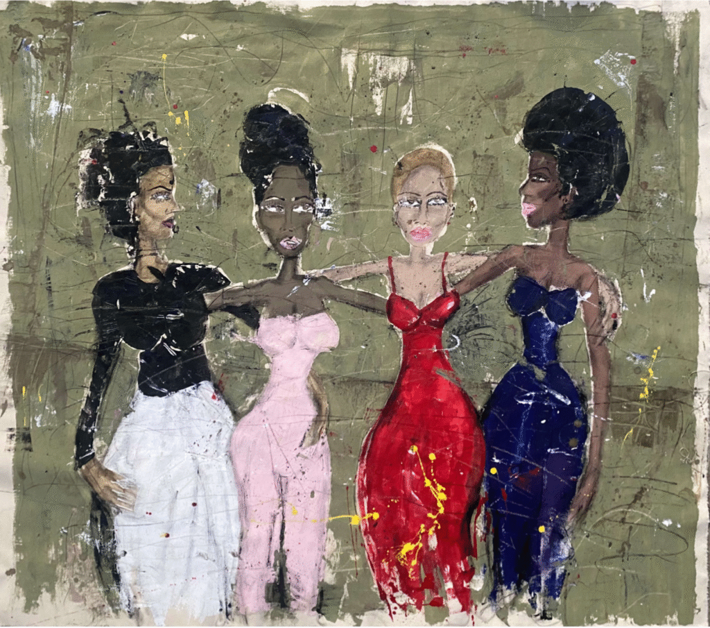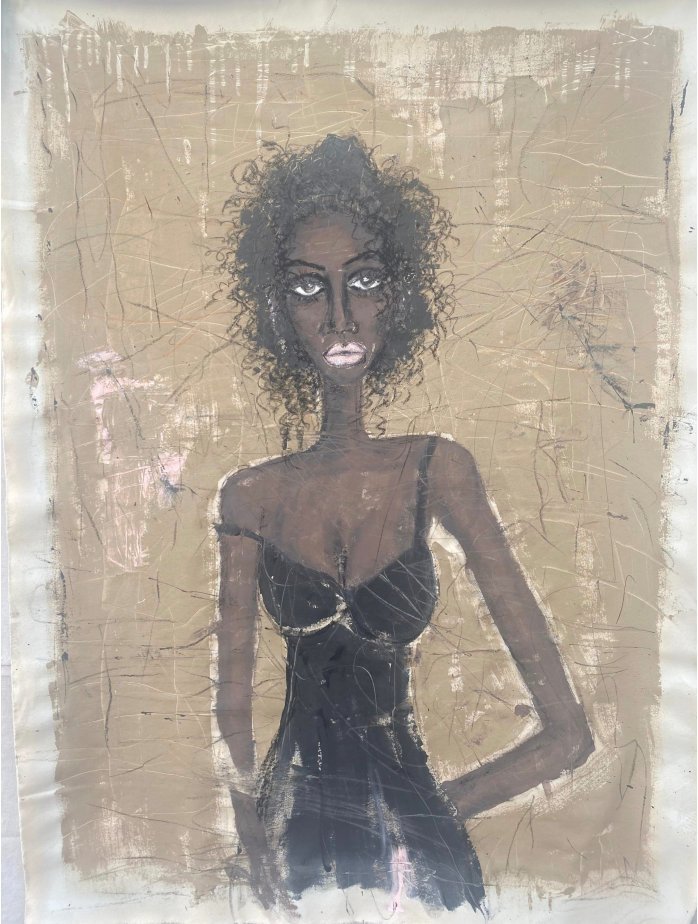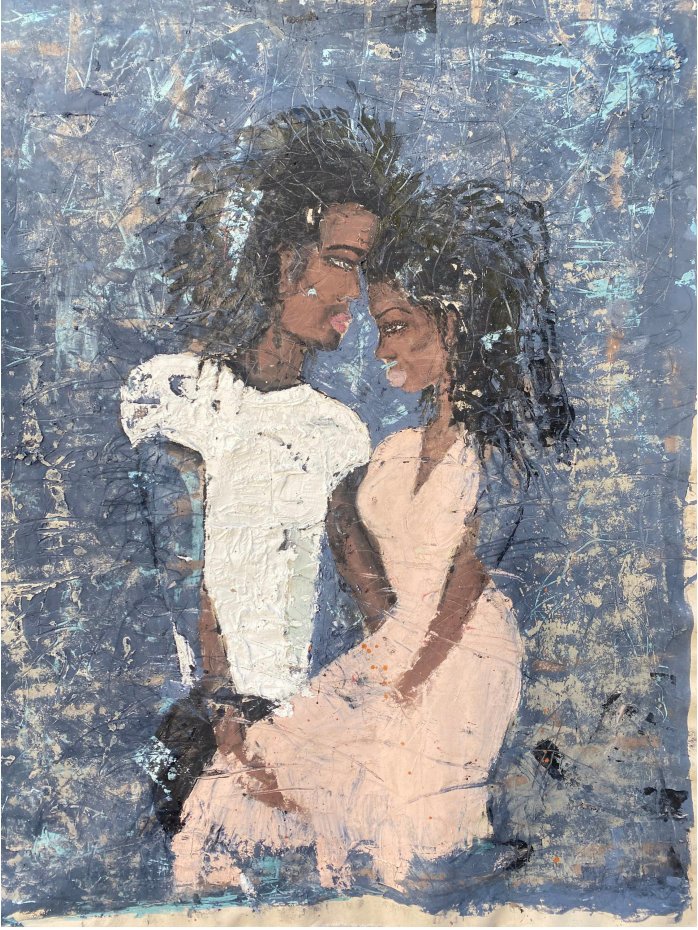 In the life and studio of LA-based, Trinidad-born artist Miles Regis, every action is an opportunity for creative self-expression. Prolific in both fine art and fashion design, he freely swaps materials between the two to enrich his work. His mixed media paintings incorporate dimensional collage elements—denim, buttons, sequins, and found textiles—alongside gestural abstract and figurative techniques. Aggressively hopeful, Regis embraces storytelling in stylized renditions of love, loss, freedom, activism, and living history.