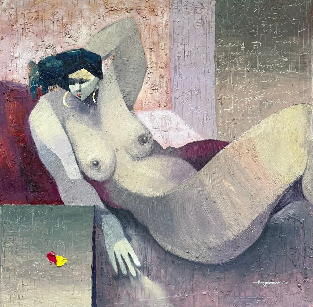 Today, painting fat subjects have become dominant in his works; a source of inspiration to him, and sometimes he uses himself as a reference. “I enjoy those forms in I see when I study the big size men and women.” His composition and use of colours have also evolved. Painting nude figures has become his favourite theme of expression. He is now audacious, expressive and explorative with his work, which are elusive, paradoxical and carefully balanced between representation and abstraction, and thought-provoking titles such as Morden Maidens, Size Matters, the Future Beckons, Lost in Thought, Spare the Rod.