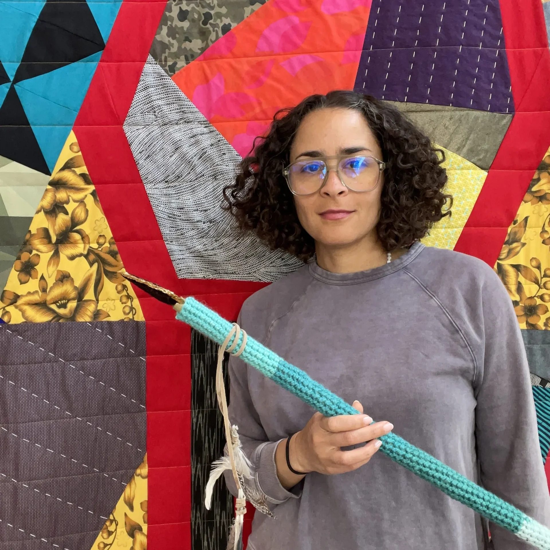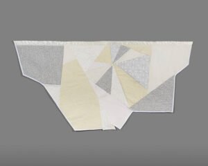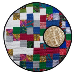 Weaving threads of African American experiences with broader ideas of identity, and collective history, my work investigates the fragile interconnectivity among all living things. Fragmented, constructed, and reassembled, I shed light on the multifaceted and complex parallels between the creative process and the nature of personal identity. My paintings feature abstracted, geometric shapes that imply movement – colourful forms expand and collapse freely among glittery backgrounds with hints of landscape and structural objects such as rooftops, windows and doors. While the textiles draw on the domestic and artistic traditions of quilt-making, they are pieced together, combining culturally diverse fabrics. While my work pays homage to the past through the use of repurposed fabrics and historical iconography, its bright atheistic imagery is informed by the future. The art reminds us of the importance of renewal and rebuilding, not only through the artistic process, but also through the possibility of transformative change. – ADIA MILLETT