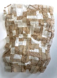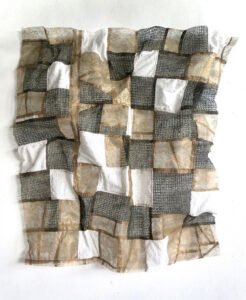 “My sculptures and collages are made of bits and pieces that I collect during my daily expeditions: cotton threads, handmade ropes made of straw or rubber, plastic bags stranded on the lake shore,” said visual artist Maliza Kiasuwa. “These materials are representative of culture and history in the context of the global flow of goods, especially in terms of how their utility values shift over time. Sometimes I combine local materials with handmade fabrics such as Japanese Washi paper. I like to blend materials which don’t belong together.” – Maliza Kiasuwa
