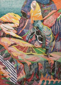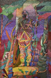 Influenced by quilts used during the Underground Railroad to send hidden messages to the traveling slaves, the drawings in Godspeed document a journey of escapism for travelers in search of a better life, for themselves and for generations to come. Quilts are used as sign markers, shields, portals, and gateways to help secure safe passage towards an “Afrotopia.” Hip Hop music, African wax fabrics, and the quilts of Gee’s Bend give form and guidance to the figures and patterns, encompassing African American history, culture, and mysticism.– MICHAEL A. BOOKER, 2020