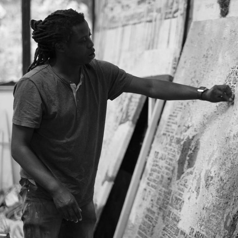 Onyis Martin was born in Kisumu, Kenya in 1987 and moved to Nairobi when he was six. Growing up, aside from school he kept himself out of trouble by playing football and doing art. When he graduated from high school, he rejected his father’s wish that he go to university and instead launched full time into fine art, which he initially developed through apprenticeships at the Godown Arts Centre and Kuona Trust in Nairobi. He is now based out of the Kobo Trust, where along with other artists, he mentors and facilitates aspiring artists with opportunities to develop their talent.