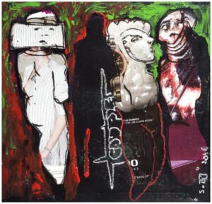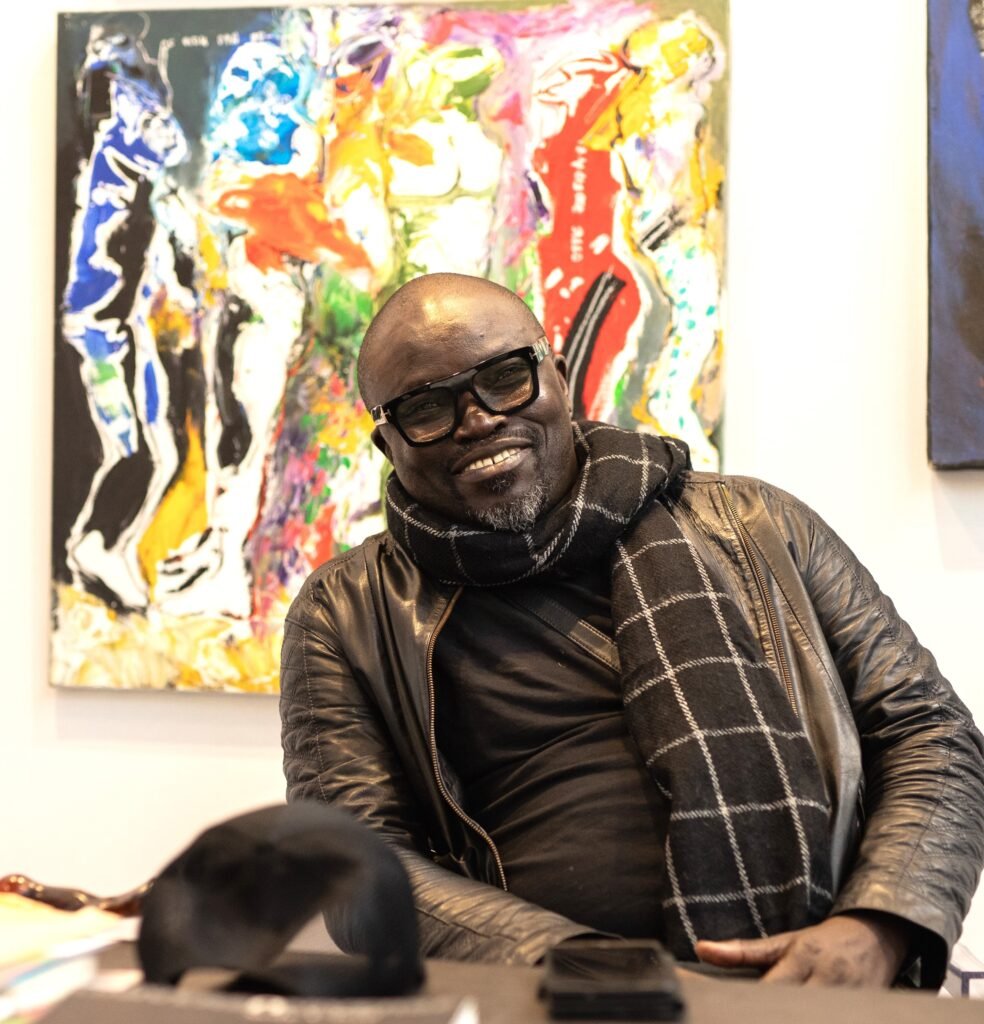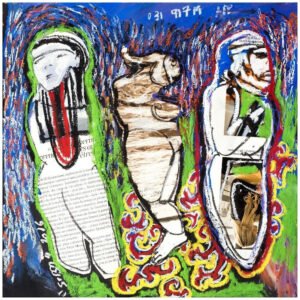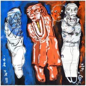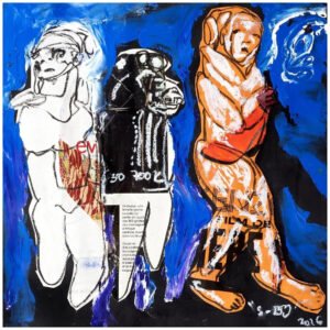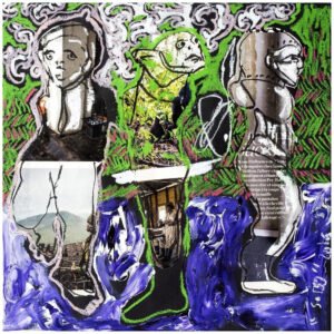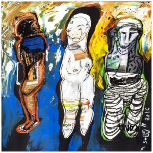 Cissé’s spontaneous painterly movements, textured accents and neo-expressionistic techniques form depictions reflective of the dissolution of society’s moral thresholds, shifts attributable to globalization and modernization. Shapeless human characters distort into anthropomorphic shadows of the other self; identities lost in translation from the past to the contemporary and abstract lines and bold strokes of contrasting hues intersect, creating a layered configuration of Cissé’s mythical visions.