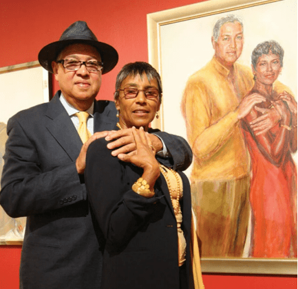 Recreating the pose in a portrait, Shirley and Bernard Kinsey are the owners of more than 100 African American artifacts and works of art currently on display at the Brogan.