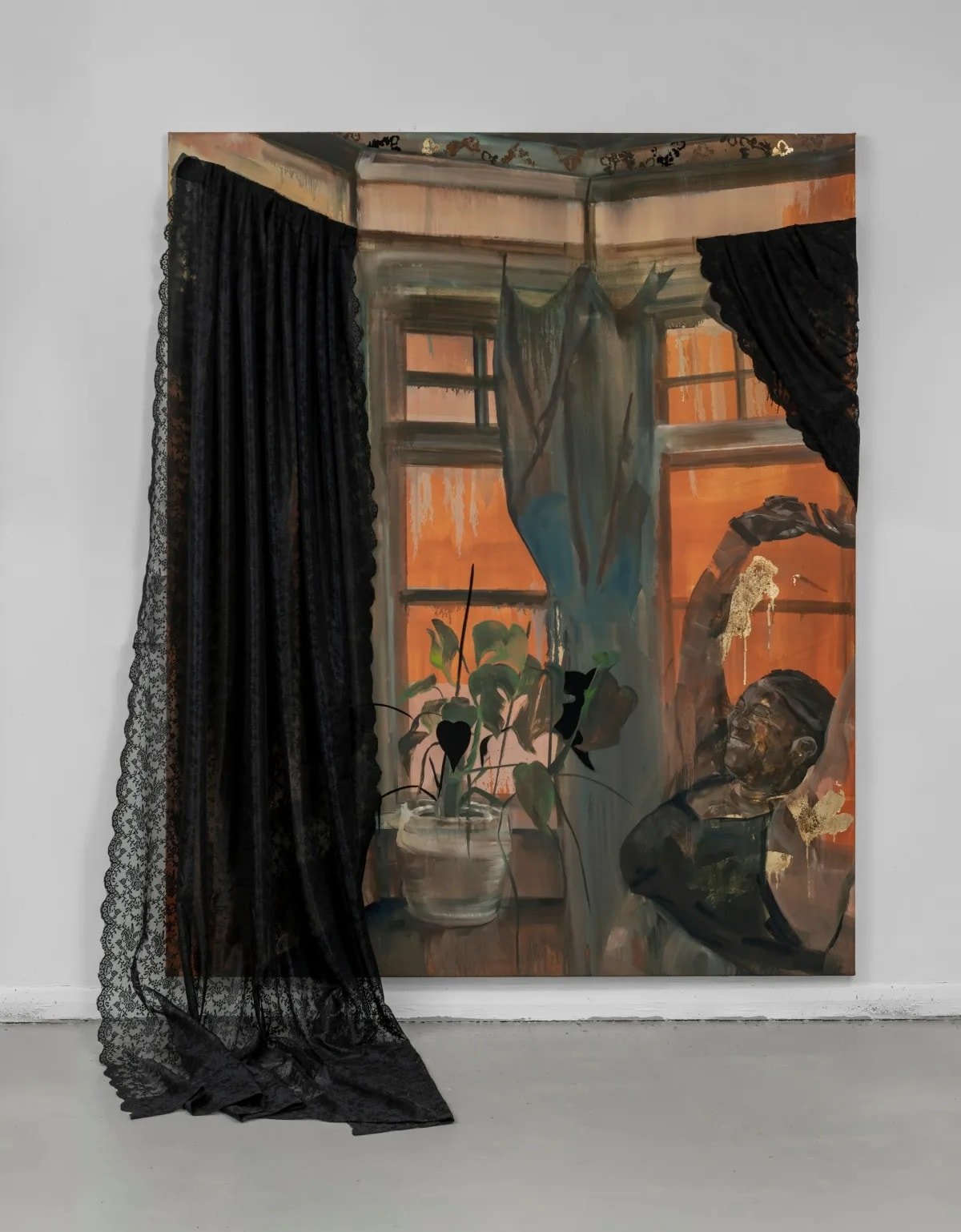 The theme of evolution or the passage of time is emphasized by the use of Schlage metal, a fusion between copper and zinc that yields a brassy, gold-leaf imitation. Prempeh applies it to selected areas of her often large-scale paintings and, over time, this oxidises, creating slow, live visual changes that animate the image. It becomes a vehicle to narrate and experience the passing of time, memory and its representation.