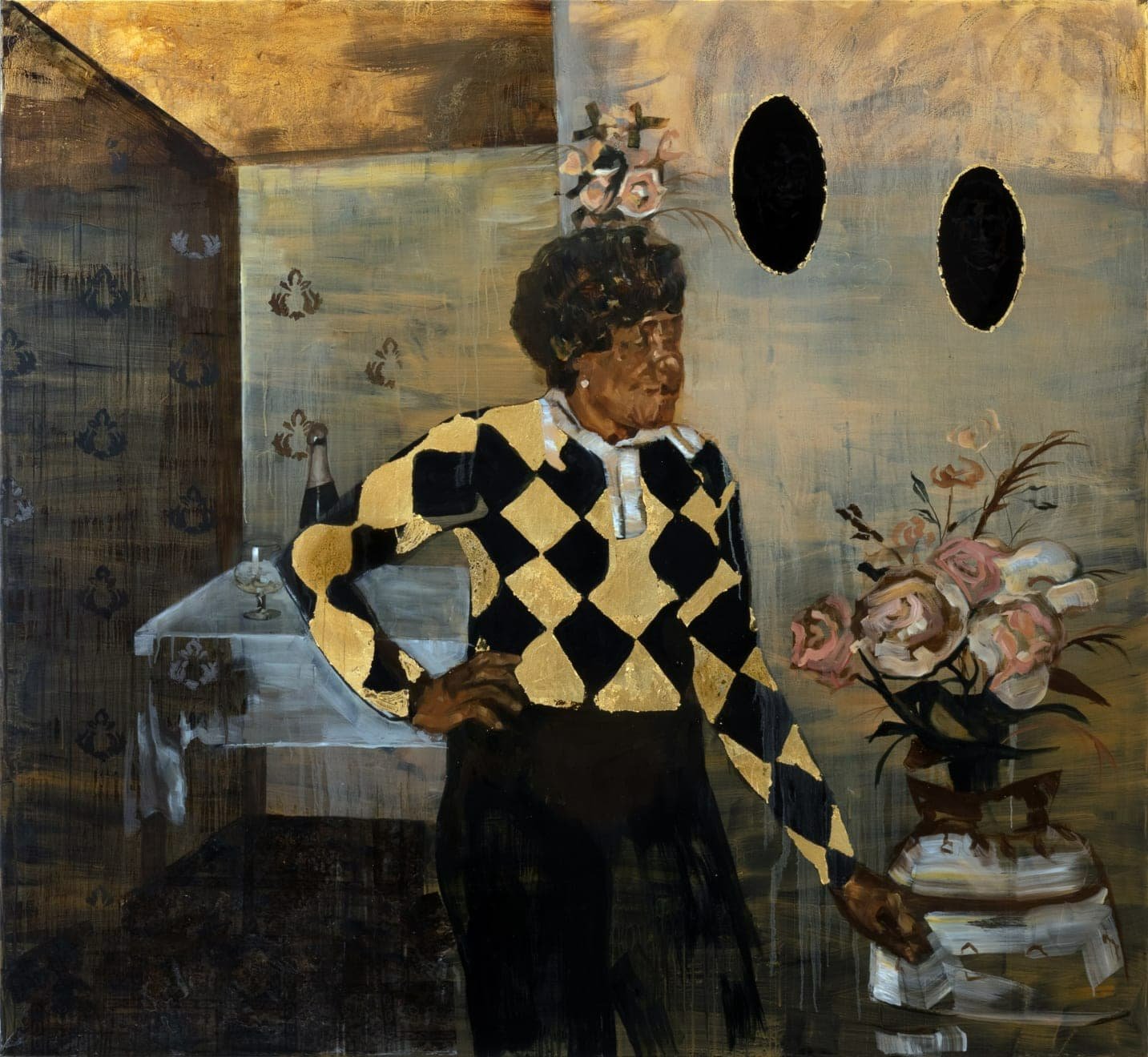 Together with objects, Prempeh often fills her canvases with variegated characters playing out their scenes in living rooms, kitchens and bedrooms. Go Liming, staged in a home interior signified by the wallpapered background, is steeped in nostalgia. The scene shows a crowd dancing — or “liming”, the art of doing nothing while sharing food, drink, conversation and laughter. In She’s Back a Yard a grandmother figure stands in a room with patterned walls, faux flowers and a table covered in a lace cloth — dressed in a gold and black checkered jersey, hand on hip the image harks back to a different time.